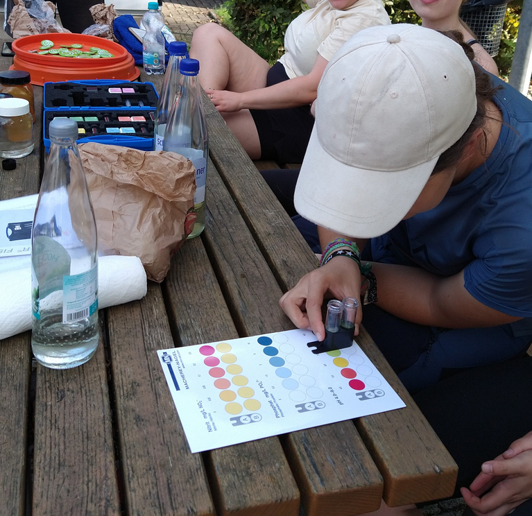 Ein besonderer Programmpunkt war die Entnahme von Wasserproben. Die Teilnehmenden konnten an verschiedenen Stellen Wasserproben für chemische Untersuchungen entnehmen. Mit einem Chemiekoffer wurden die Proben auf die Konzentration von Stoffen wie Phosphat, Nitrat und Nitrit getestet. Außerdem kescherten die Teilnehmenden nach Organismen im Wasser. Diese Lebewesen, sogenannte Indikatororganismen oder Saprobien, zeigen die Gewässerqualität an. Die erfreuliche Nachricht: Es wurden keine Anzeichen für schlechte Wasserqualität gefunden.